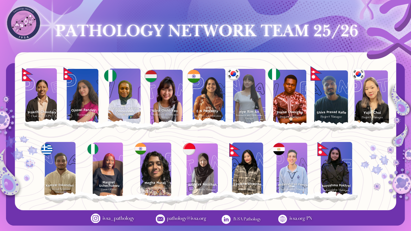 The Pathology Network (PN) serves as a platform dedicated to veterinary students who are enthusiastic about veterinary pathology, complementing the global network of IVSA members. By facilitating collaborations with specialists, the PN aims to present the diverse interdisciplinary aspects of veterinary pathology and enhance significant youth engagement in this field, fostering a strong connection between veterinarians. In doing so, the PN actively contributes to IVSA's diversity by introducing the first network focused on the paraclinical field of Veterinary Medicine.