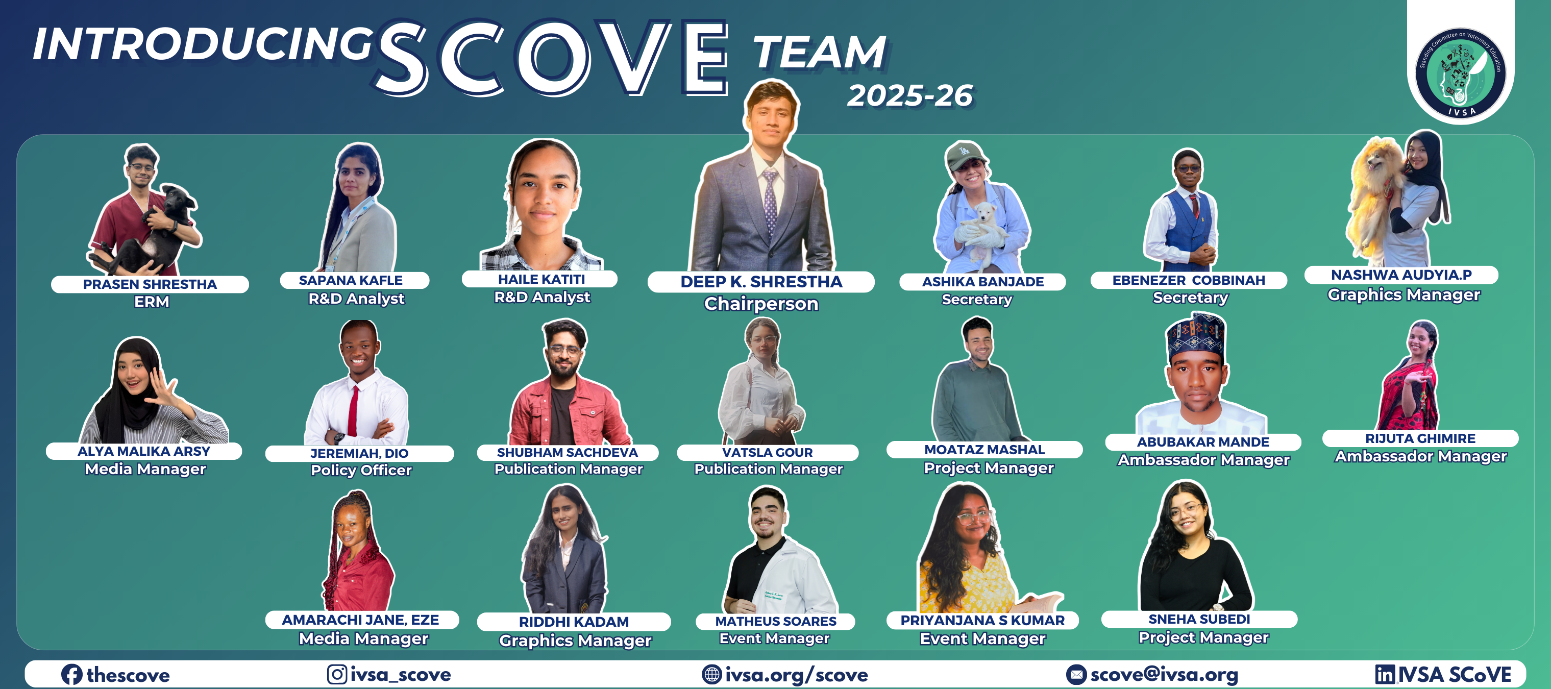 The SCOVE Ambassadors are an extensive network of vet students worldwide that serve as the bridge between the committee and their local faculty and its students. They promote SCOVE-related programs, encouraging student participation and amplifying the impact of our committee’s agenda in “improving veterinary education worldwide”.