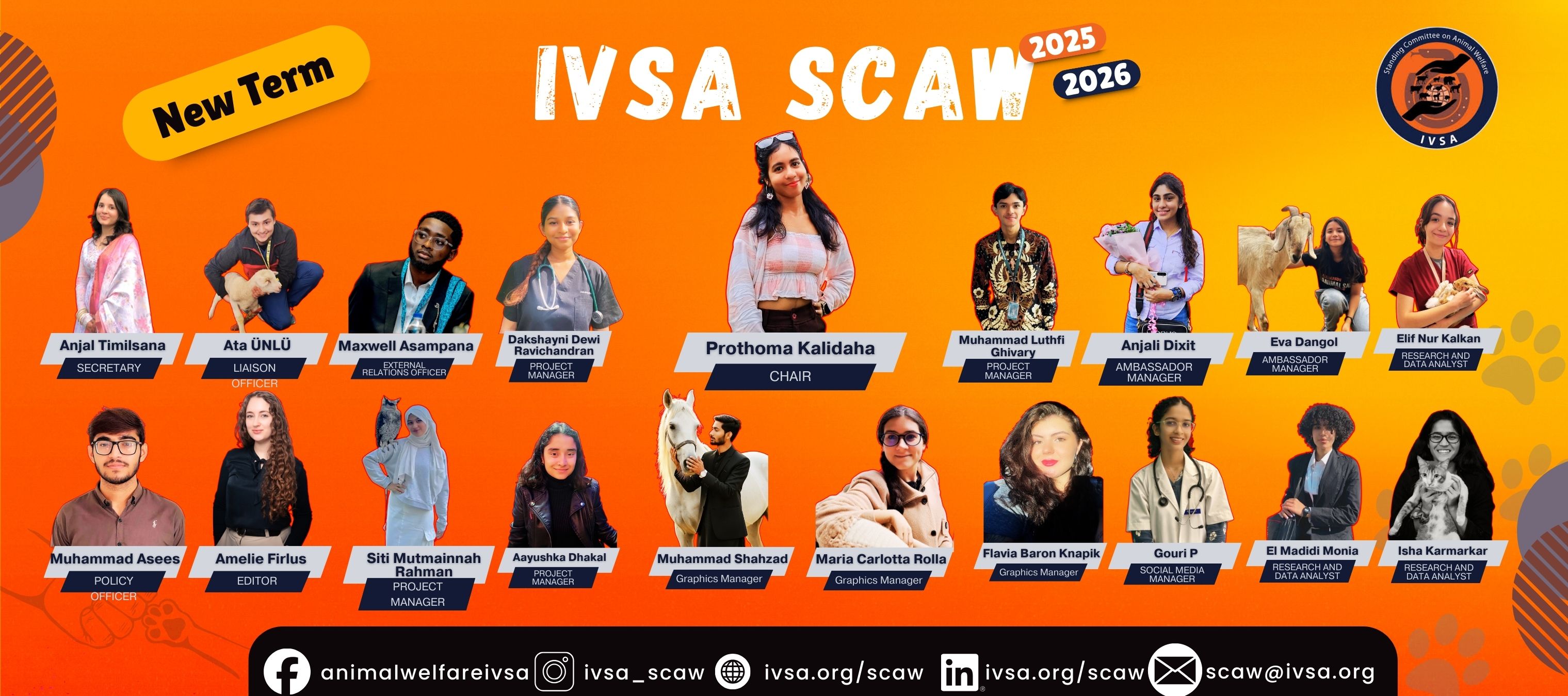 The IVSA Standing Committee on Animal Welfare (SCAW) is committed to advancing one of IVSA's primary goals: actively championing initiatives to elevate the global standard of animal welfare. Our focus lies in mobilizing veterinary students worldwide to foster heightened awareness and education about animal welfare. Through these efforts, we strive to cultivate a world where the well-being of animals is upheld to the utmost standard, fostering a harmonious coexistence between animals and humans while safeguarding our environment.